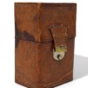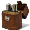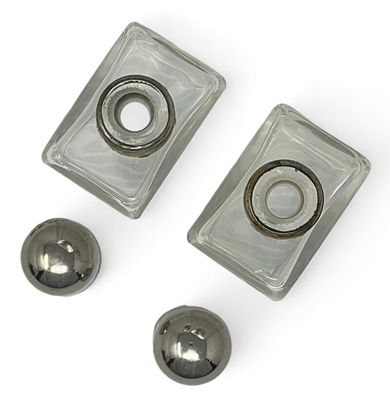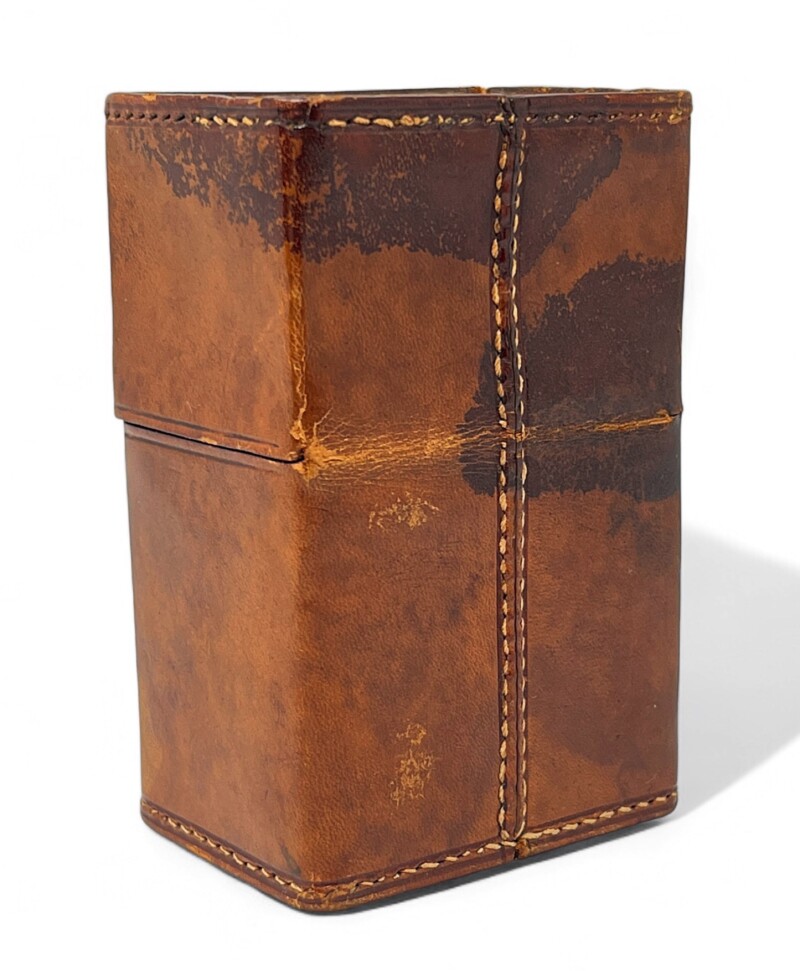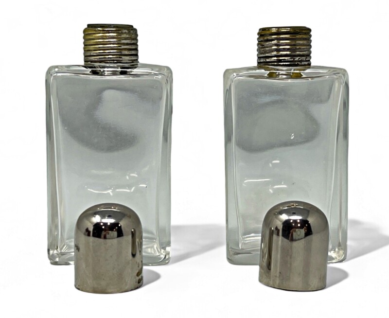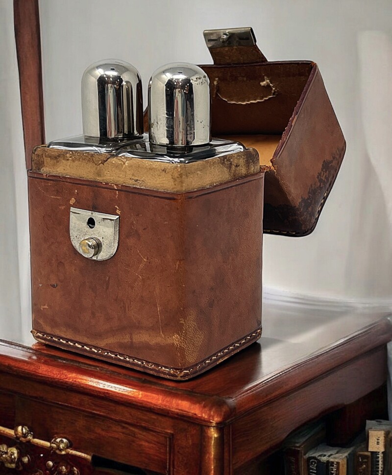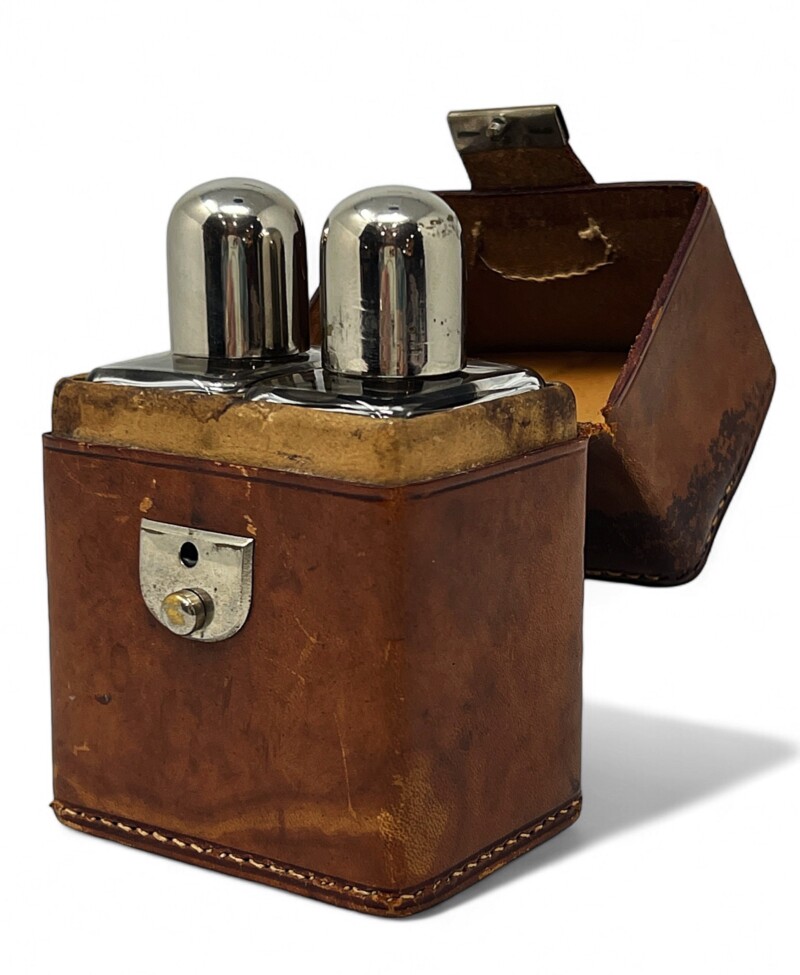 Handsome mid century  perfume/cologne travel set of 2 lovely rectangular glass bottles with silver plate dome lids or screw caps. Visually hidden within the lid is 1 original glass stopper and a replacement cork stopper are both in place.  The sturdy tan leather case with white stitching is slightly worn or “travel stained” due to age and use but the super metal clasp is in good working order. This is a set not only for perfume collectors but travellers both women and men, who appreciate amazing design and like to carry their own shampoo and conditioner in adorable small glass bottles!