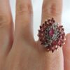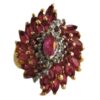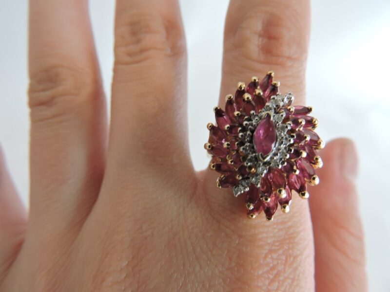 A ‘Vintage Ruby & Diamond 10 Kt Gold Ring’ – dates 1950’s/ 1960’s. It features a unusual design, decoarted with a bold cluster of round and marquis-shaped rubies and diamonds, with 10kt yellow gold. Exquisite quality.