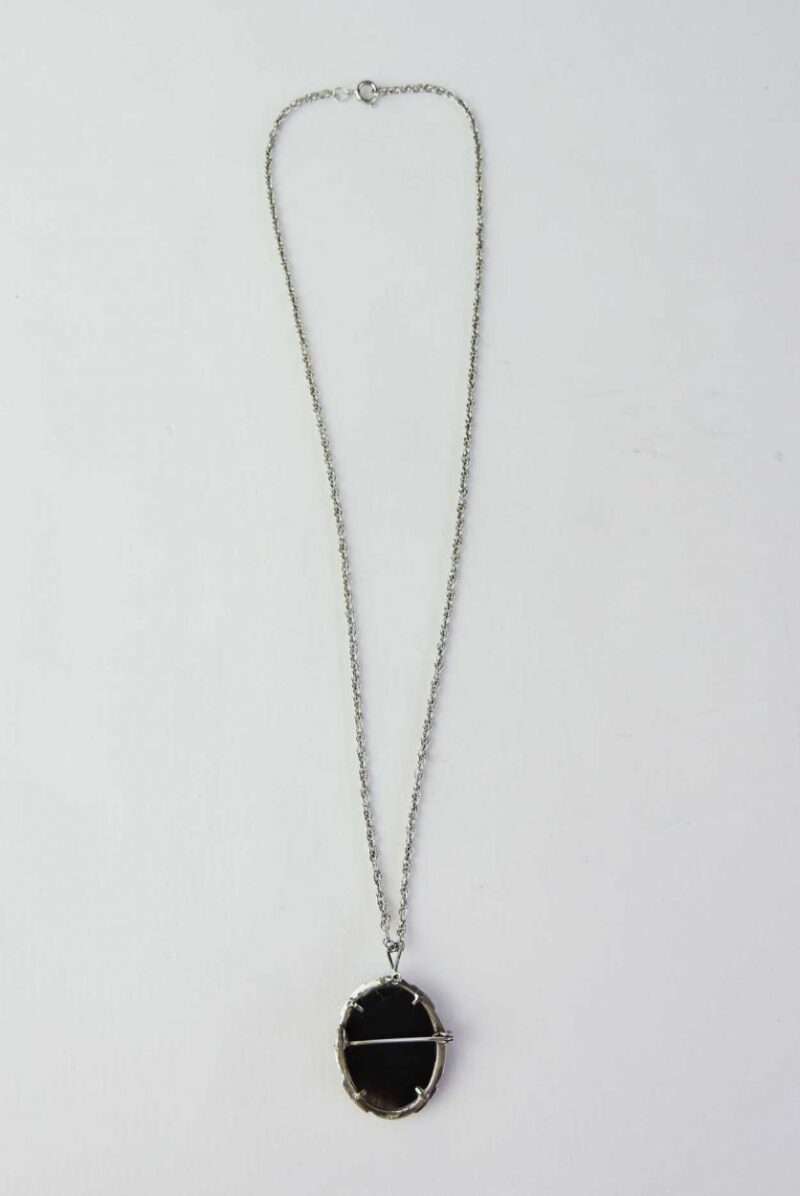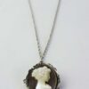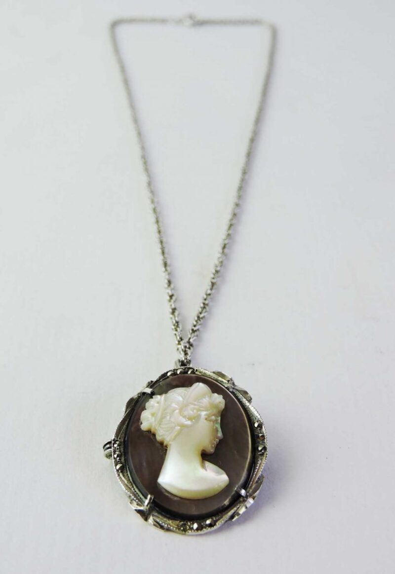 v** SOLD ARCHIVES **vA lovely vintage costume jewelry necklace, consisting of a sterling and cameo pendant, and a silver chain with spring clasp. The silver chain measures 18 inches in length, with a small spring clasp. The back of the cameo pendant was once used as a brooch, with working pin and clasp at the back. The front features a portrait in the centre of a young maiden figure in an ivory colour surrounded by a grey stone background. It is decorated with an elegant sterling border with a flower and leaf design.