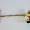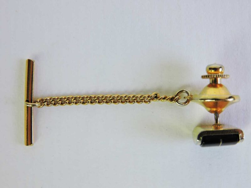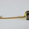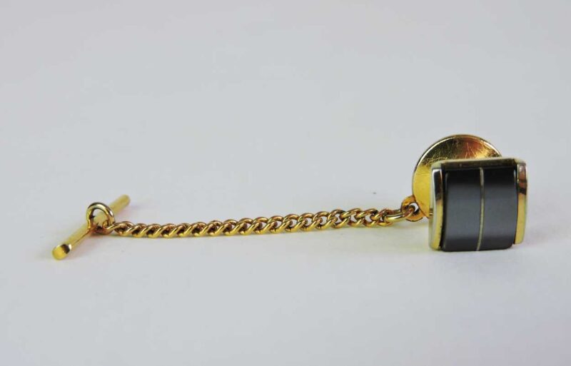 A vintage tie tack in a gold tone, with a hematite stone, it dates 20th century. It consists of a stone, and a short attached chain with bar. The stone is a dark charcoal tone with a thin gold line tone in the centre. It is the right combination of a timeless bold style with a quality aesthetic.