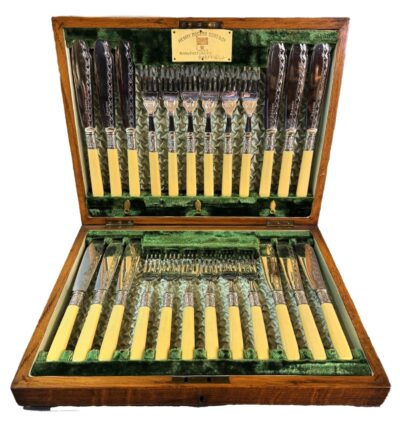 Silver Flatware SetsLarge set of Wallace “Rose Point” sterling silver flatware, introduced in 1934 and popular ever since. The pattern was inspired by the intricate details of needlework and lace work, showing scrollwork, roses and pierced handles. This large and comprehensive set is comprised of 12 place settings of 9 pieces per place setting, plus 6 serving spoons, 2 butter knives, 2 small two pronged forks, 1 sugar spoon, 1 small cake server and the handsome box to accommodate is included. The set is 120 pieces in all and in great condition. A wonderful luxurious addition to any dining room.