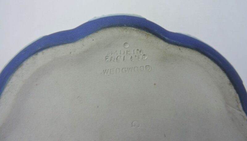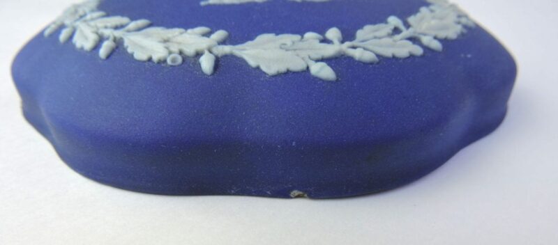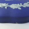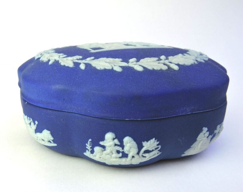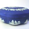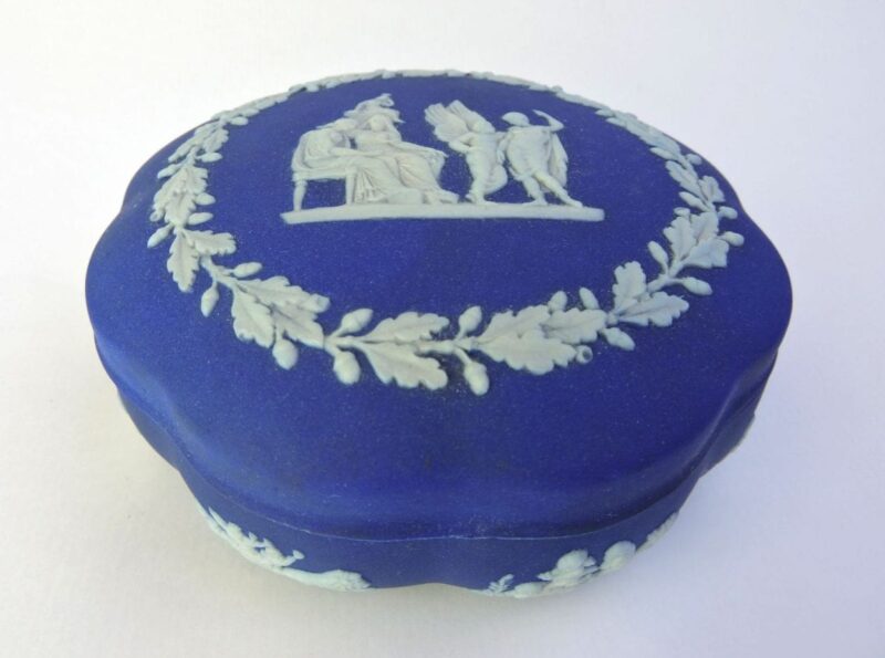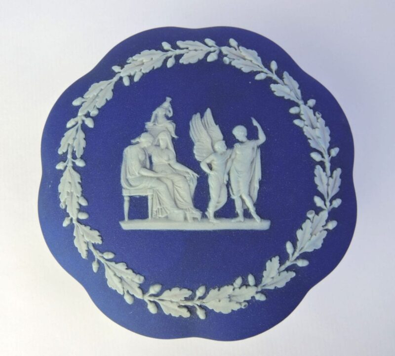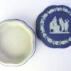 Wedgwood Blue Jasper Ware Covered Box, Scalloped Rim and Body, Decorated with Grecian Scenes and Putti Figures