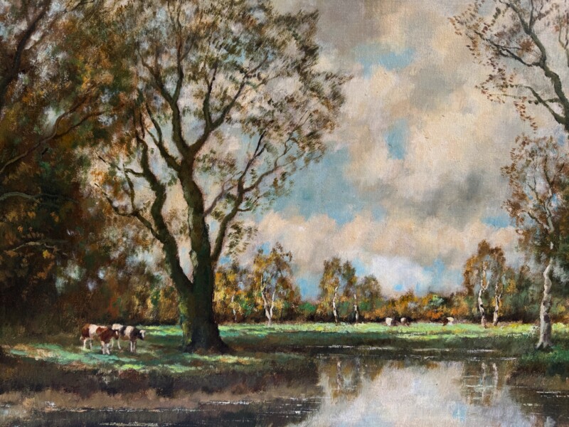 ArtWillem Hendriks, Jr (Netherlands: 1888 – 1966) Dutch oil painting on canvas of cattle by a river landscape. Signed by the artist to lower left. Willem Hendriks Jr., son of an established Dutch artist Willem Hendriks Sr., was born in the Netherlands outside of Brussels. He lived primarily in Holland, between La Haye and Voorburg, though he traveled to and spent significant time in the United States and Canada were his paintings were very popular.