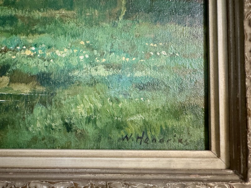 v** SOLD ARCHIVES **vWillem Hendriks, Jr (Netherlands: 1888 – 1966) Dutch oil painting on canvas of a pastoral scene of cattle by a thatched cottage on a river in a spring landscape. Signed by the artist to lower left. Willem Hendriks Jr., son of an established Dutch artist Willem Hendriks Sr., was born in the Netherlands outside of Brussels. He lived primarily in Holland, between La Haye and Voorburg, though he traveled to and spent significant time in the United States and Canada where his paintings were very popular.