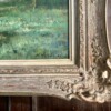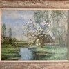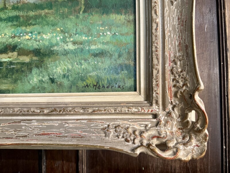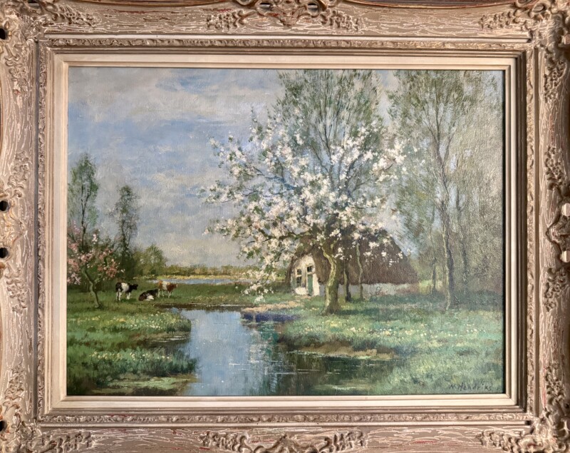 This canvas provides not only a Dutch pastoral landscape example but an emotionally captivating view of a river landscape in the spring with gorgeous light and tree blossoms. Willem Hendriks must have loved this theme as many of his works depict different parts of a “river landscape”. The handsome frame adds to the historical time period of the work.