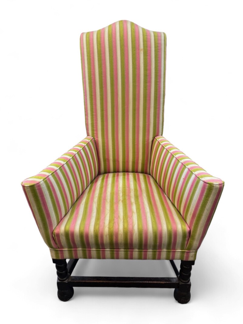 A Vintage William & Mary style armchair with a high back “throne” appeal and cushioned seat resting on a solid square wood frame with heavily carved front legs. Reupholstered in a jazzy pink, mossy green & cream coloured stripe fabric giving a “modern flare” that is suitable for any room.