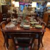 A handsome, large dining room table that has 2 leaves and a crank that winds open the table when adding or subtracting leaves.