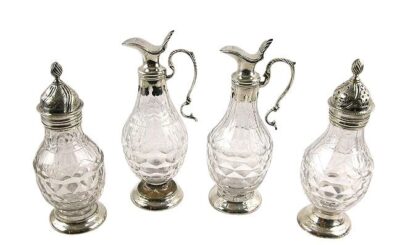 A four piece William IV period sterling Irish tea service with heavily embossed floral design.  Set consists of coffee pot, tea pot, creamer and large sugar.  Dated 1834 – maker Charles Marsh – Dublin