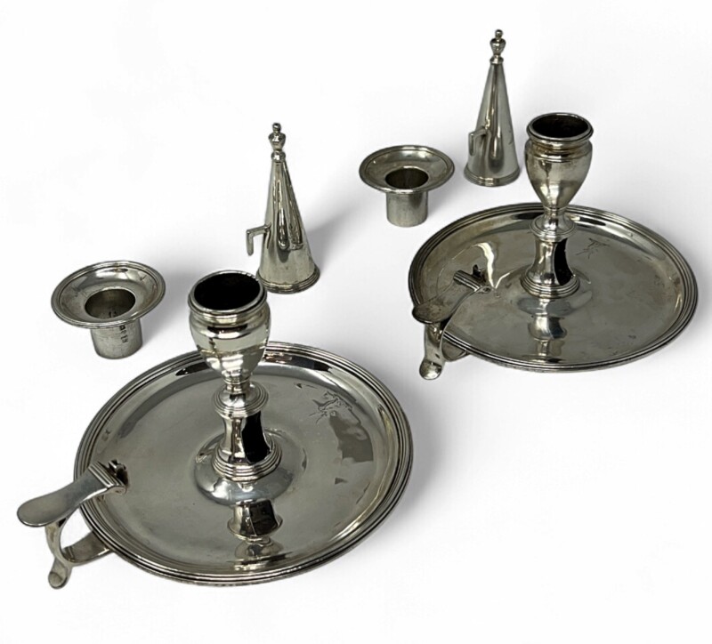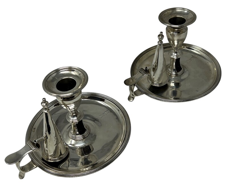 Wonderful & Rare British Georgian Sterling Silver Pair of Chambersticks with Conical Extinguishers by Renowned Silversmiths John Crouch II & Thomas Hannam – Dated 1801
