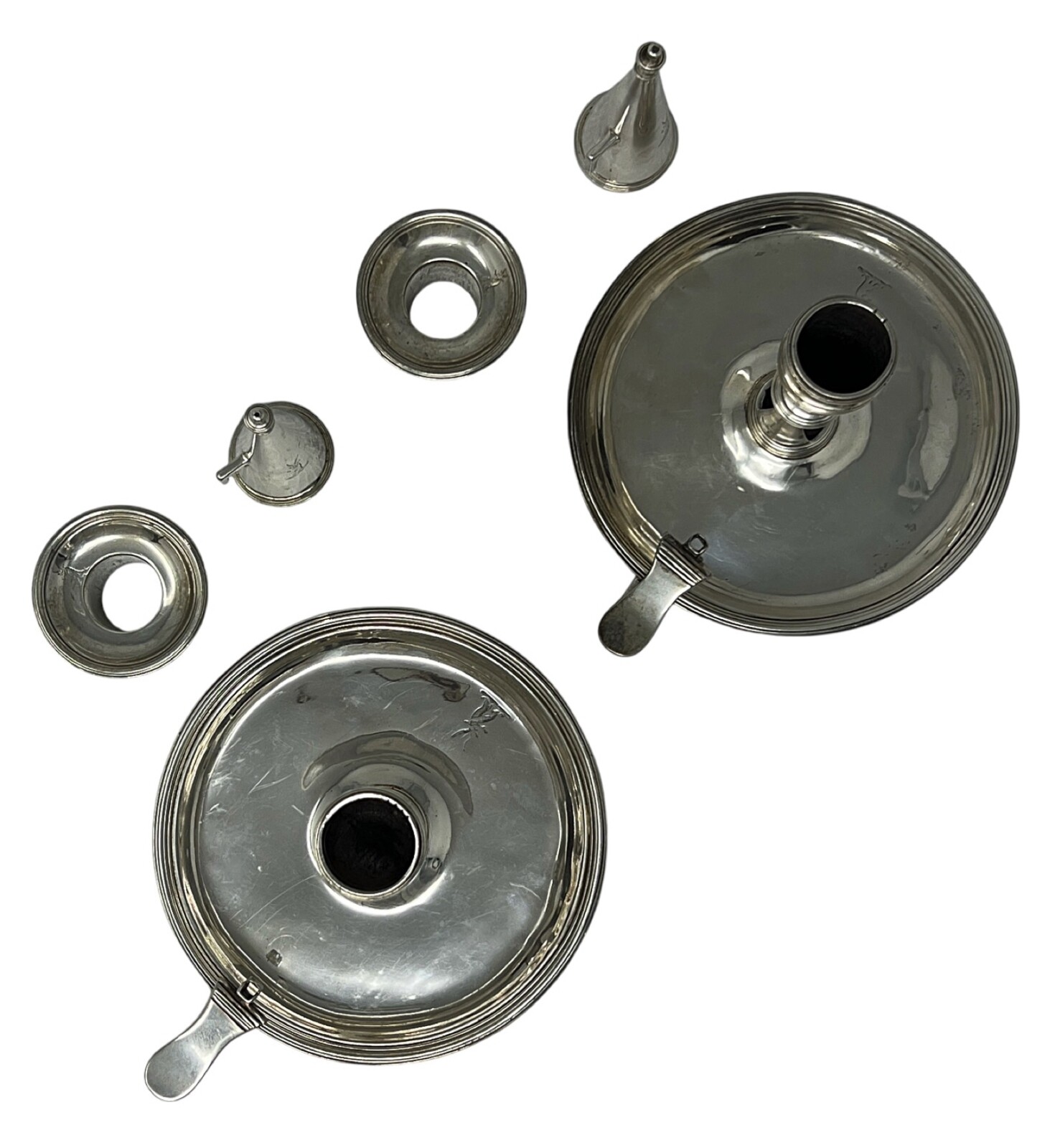 Chambersticks were the ancestor of the flashlight and were a very common object in the great houses of the eighteenth century. The English call it “Chamberstick”, the candlestick to go to the bedroom. These chambersticks are always accompanied by a snuffer that is placed on the candle to prevent the smell of smoke from the wick that has just been extinguished. Chambersticks lit the way as you moved around the house at night, and these chamber candlesticks are dish-shaped to catch any spilled wax and have removable nozzles to ease the cleaning of the spent wax. A full set of hallmarks is located to the underside of the base of both pieces and all component parts are equally marked. A crest of a “stag” is engraved on all pieces symbolizing strength, nobility and guardianship.