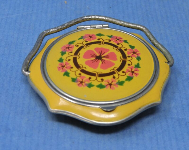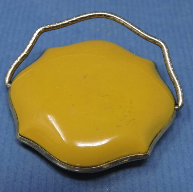 Yellow Enamel & Silver-plated Small Compact with Mirror and Original Powder Puff & Powder Remnants, circa 1920